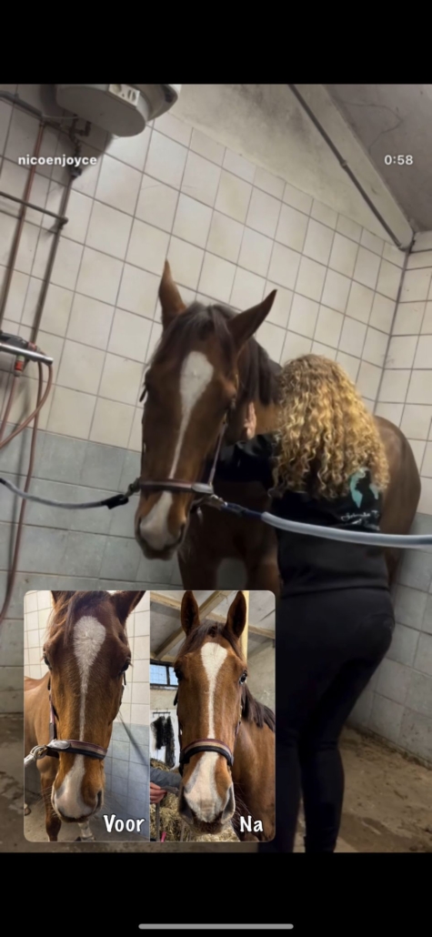 Deze manier van werken ondersteunt het zenuwstelsel, helpt bij diepe ontspanning en bevordert de natuurlijke balans in het lichaam. Paarden reageren vaak met kauwen, zuchten of het laten zakken van het hoofd, signalen dat er iets van binnenuit loslaat.